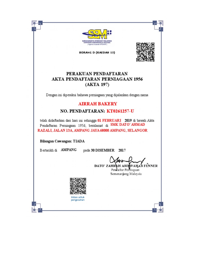 Perakuan Pendaftaran Perniagaan Borang D Ssm Kosong