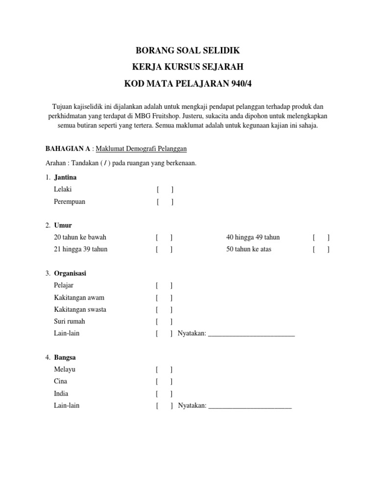 Contoh Borang Soal Selidik Kerja Kursus Sejarah