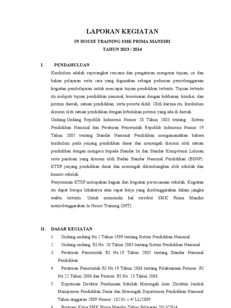 Contoh Laporan Kegiatan In House Training Kumpulan Contoh Laporan