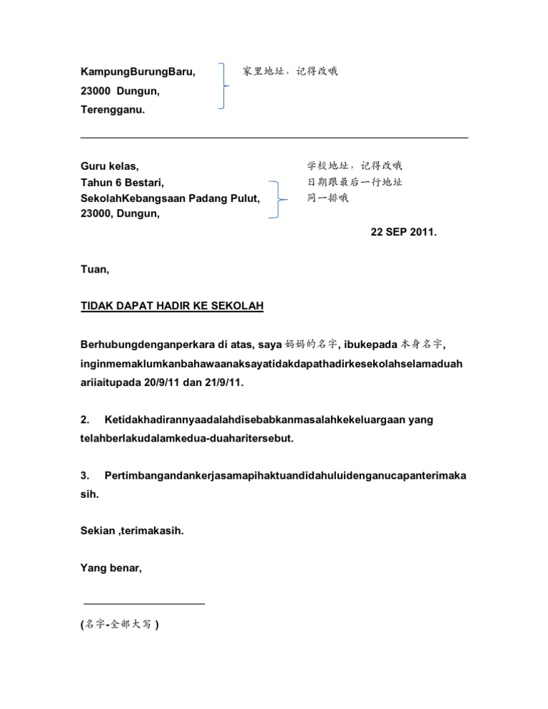 Surat Rasmi Tidak Hadir Ke Sekolah Atas Urusan Keluarga Dan Sebagainya