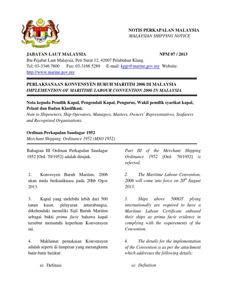 Notice Of Implementation Of Mlc 2006 In Malaysia Occupational Safety And Health Sailor