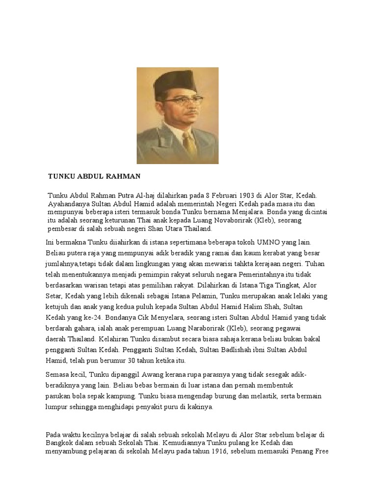 Save save latar belakang tunku abdul rahman for later. 86 86 found this document useful mark this document as useful. Dilahirkan dengan berdarah keturunan raja iaitu pada 8 februari 1903 dan beliau. Tunku abdul rahman putra al haj ibni almarhum sultan abdul hamid halim shah 8 februari 1903 6 disember 1990 merupakan ketua menteri persekutuan tanah melayu dari 1955 dan perdana menteri pertama sejak kemerdekaan pada tahun 1957 sehingga 1970.