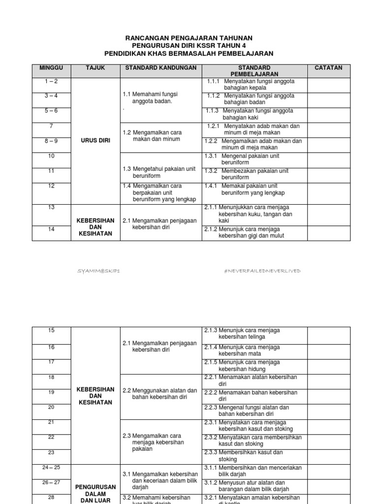 Rpt Pengurusan Diri Tahun 4 Pendidikan Khas Bermasalah Pembelajaran
