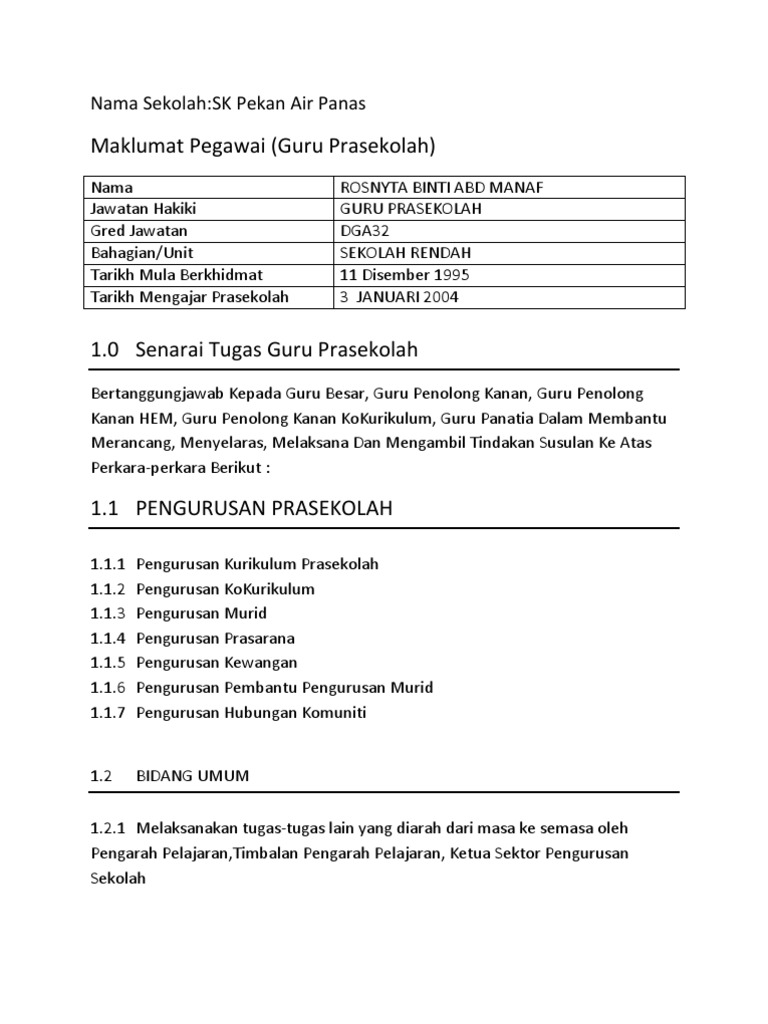 Senarai Tugas Guru Prasekolah