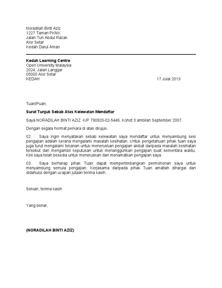 Contoh Surat Tunjuk Sebab Lewat