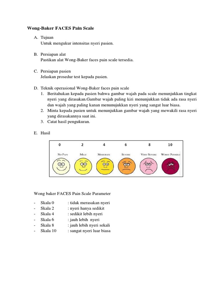 Welcome to the wong baker faces foundation the official home of the this tool was originally created with children for children to help them communicate about their pain. Initially the numbers 0 5 were used to quantify the pain but using the numbers 0 2 4 6 8 10 avoids confusion as it is more consistent with the numeric rating scale of 0 10. Hampir setiap pasien dipastikan terdapat nyeri. The wong baker face pain rating scale is the pain scale most preferred by physicians parents and children.